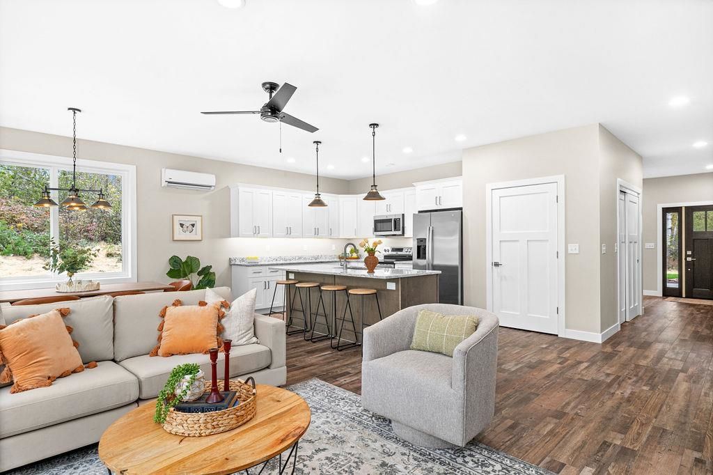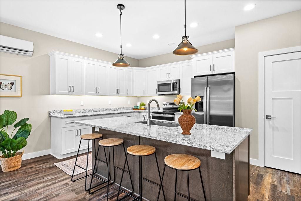 Situated on a private lot, this brand-new one-level townhome seamlessly blends style, comfort, and convenience. The open-concept layout offers spacious living areas, large windows, and a bright, airy atmosphere. A cozy gas fireplace anchors the living space, creating the perfect spot to relax or entertain. At the heart of the home, the kitchen impresses with elegant counters, a center island, and ample space for cooking and gathering. The primary suite features a generous walk-in closet and a private ¾ bath with dual sinks and a beautifully tiled walk-in shower. Two additional bedrooms and a full bath provide plenty of space for family or guests. Additional highlights include a well-appointed laundry room, an attached garage, and in-floor heating throughout. With no HOA, you'll enjoy the freedom of ownership without extra fees or restrictions. Just minutes from shopping and local amenities, this carefully constructed home offers the perfect combination of carefree living and accessibility.