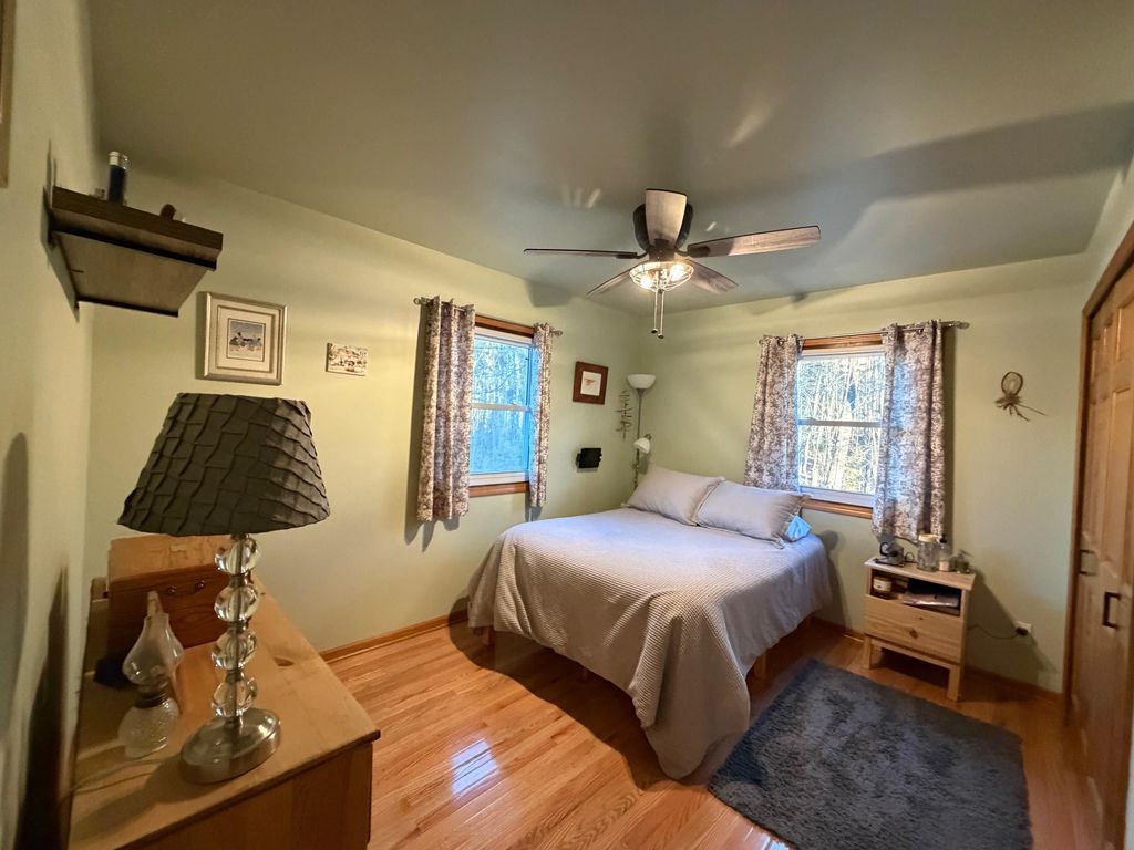 Welcome to your new home! 5 acres of woods, with a big pole building/garage and a spacious 3 bedroom home is all waiting for you. One of the first things you'll notice is the expansive deck that wraps two sides of the home. Perfect for enjoying quiet nights away from the city lights. The main floor has two bedrooms with good closet space, a full bathroom, a living room/dining room combo and your kitchen. The main bedroom has all been recently redone including beautiful new oak hardwood floors. The bathroom has also been updated, and you'll stay cozy with a pellet stove as the center piece of your living room. Upstairs is a large bedroom with a generous closet - don't you love the floor at the top landing? Downstairs is a walk out basement that is half finished - there is a rec room with another pellet stove, plus a bonus room that would make a great home office, but is currently used as another bedroom. The back half of the basement is home for the laundry and so much storage! There is also a large fenced yard for your furry friends. And don't miss the garage!! The east side is finished and insulated. The west side can store all your toys and has an extra tall overhead door. Each side has a garage door opener. Come see this great property today!