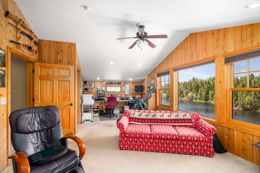 A Rare Luxury Retreat at the End of the Gunflint Trail and Lakeside Living on Pristine Gull Lake! Welcome to an extraordinary opportunity to own a true Northwoods sanctuary at the edge of the Boundary Waters Canoe Area Wilderness. Set on the crystal-clear shores of Gull Lake"”one of Minnesota's most secluded and unspoiled lakes"”this stunning four-bedroom, three-bath home sits on approximately five acres with 467 feet of private frontage, offering unmatched tranquility, world-class fishing, and timeless natural beauty. Very little private property exists on Gull Lake, making this a truly rare find. This property offers the perfect blend of wilderness adventure and refined luxury. Launch a canoe from your dock and paddle into the BWCAW, or fish the very waters where the Minnesota State Record Walleye was caught. After a day of exploration, retreat to the comfort of a beautifully designed home that caters to both relaxation and entertaining. The gourmet kitchen features granite countertops, custom cabinetry, a striking tile backsplash, wine rack and cooler, and breakfast bar seating. A window-lined dining area invites natural light and scenic views, while the expansive living room with maple flooring and a stone wood-burning fireplace offers cozy elegance. Patio doors open to a sun-drenched deck overlooking the lake"”ideal for morning coffee or sunset gatherings. The main-floor primary suite is a luxurious escape with panoramic lake views, a walk-in closet, and a spa-style, custom-tiled bathroom with a walk-in shower. Guests will enjoy the additional main-floor bedroom with stunning views and full bath featuring a copper sink and tiled tub/shower. Upstairs, find two more inviting bedrooms, a shared bath, and a versatile sunlit bonus room perfect as a studio, office, or media space. Two rustic, primitive guest cabins on the property provide a nostalgic Northwoods experience for visitors seeking a more rugged retreat. Other highlights include a welcoming stone-tiled foyer, a walk-in pantry, laundry room, backup generator system, attached heated garage, and a massive detached heated garage/workshop with ample space for storage, gear, and even a golf net. Whether you're looking for a private year-round residence or an unforgettable family getaway, this property offers the rare chance to live at the end of the trail"”where wilderness, comfort, and luxury meet on the shores of one of Minnesota's most iconic lakes.