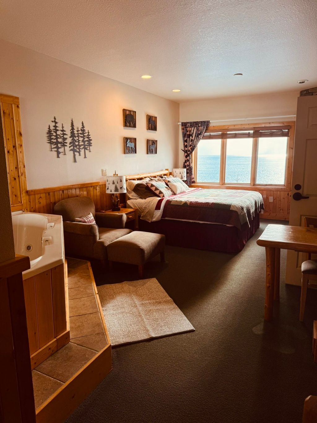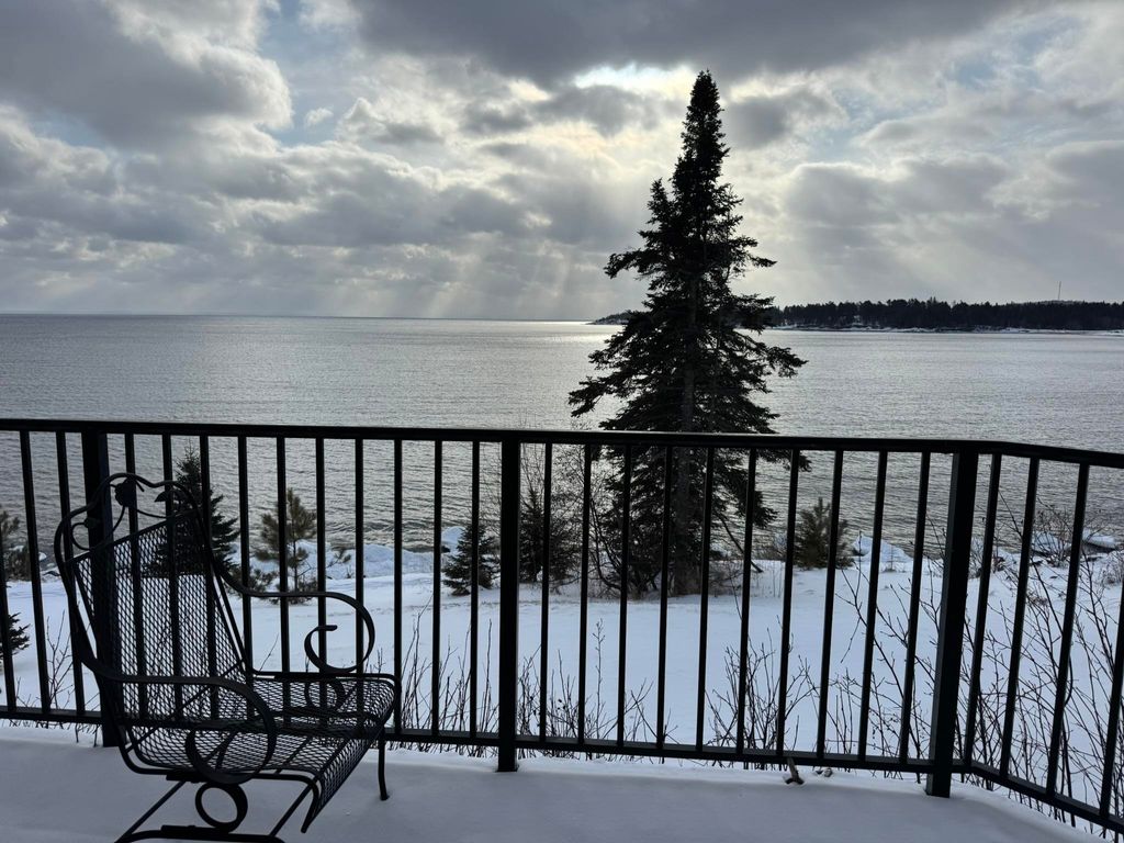 Incredible view of Lake Superior with a nice pine tree for accent! This is a full ownership of the 3 rooms, there is a main entrance into the Kitchen, Dining room and Living room with access to the primary suite with own soaking tub, fireplace and spectacular views and secured access to the 2nd bedroom that can be its own lock out rental or part of this unit There is a kitchenette, soaking tub, 3/4 bath, fireplace and wonderful views of Lake Superior! Currently not in the rental pool but you absolutely can join and make some income while you are not there. Building 3 has the pool and outdoor hot tub area overlooking the lake. Elevator access and parking out front. There are some extra reserves being taken out of the fee's to maintain the shoreline and do some routine maintenance. This property has recently been connected the paved biking/walking trail to access town, the lighthouse, breakwall and watch the ore boats come in, no car needed! Call for your one on one showing soon!