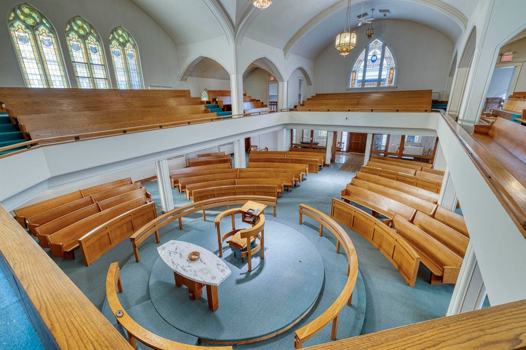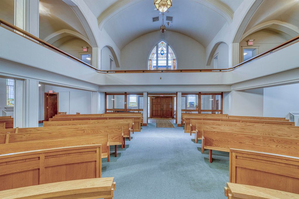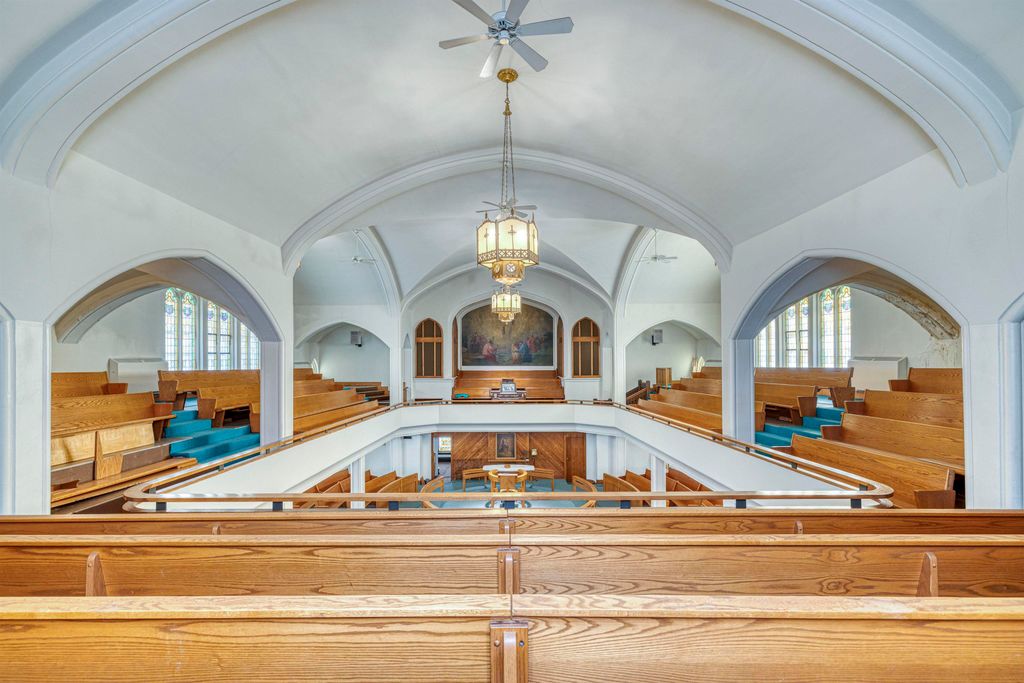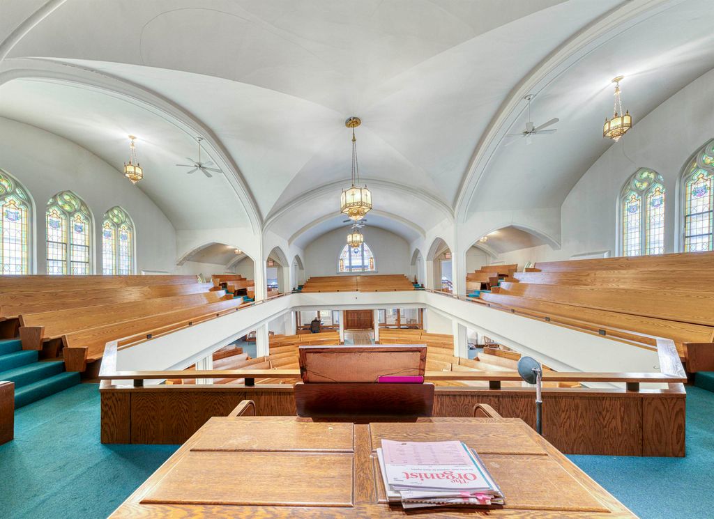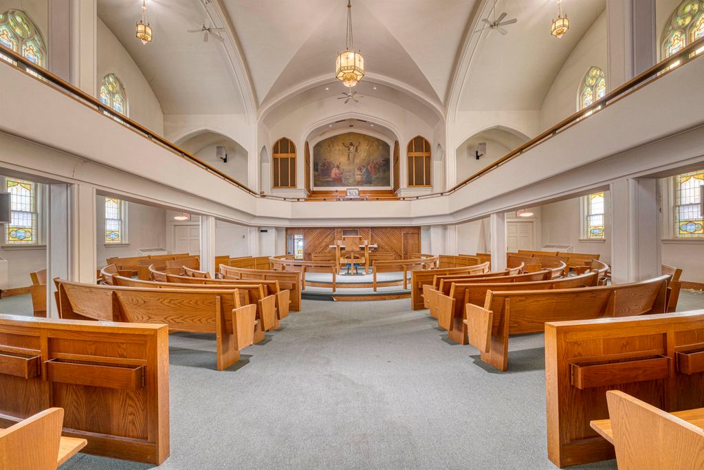 An unusual design for a 1903 Church building, the oak pew Sanctuary is designed in the round, allowing for viewing from all angles. There are numerous classic stained-glass windows appraised in 2018. The Organ remains in the building, but has not been played for a few years; and a large, beautiful Christian Painting hangs above the Organ, the focal point of the wrap around Balcony. The double wooden front doors enter the Narthex. Behind the Sanctuary are Office spaces leading to a rear staircase and private exit. The Lower level boasts a Parlor, Large Dining Hall, Kitchen, Restrooms, Office/Library, and storage area. The Annex building includes 2 apartments plus 2 floors of space for creative use, including a Fireplaced lowest level with walk out to a Parking area. It is attached to the Church by a hallway and has Front and Rear entrances. Though the buildings need considerable updating, large square footage and multi-levels make options possible. City codes will need to be met by the Buyer.
