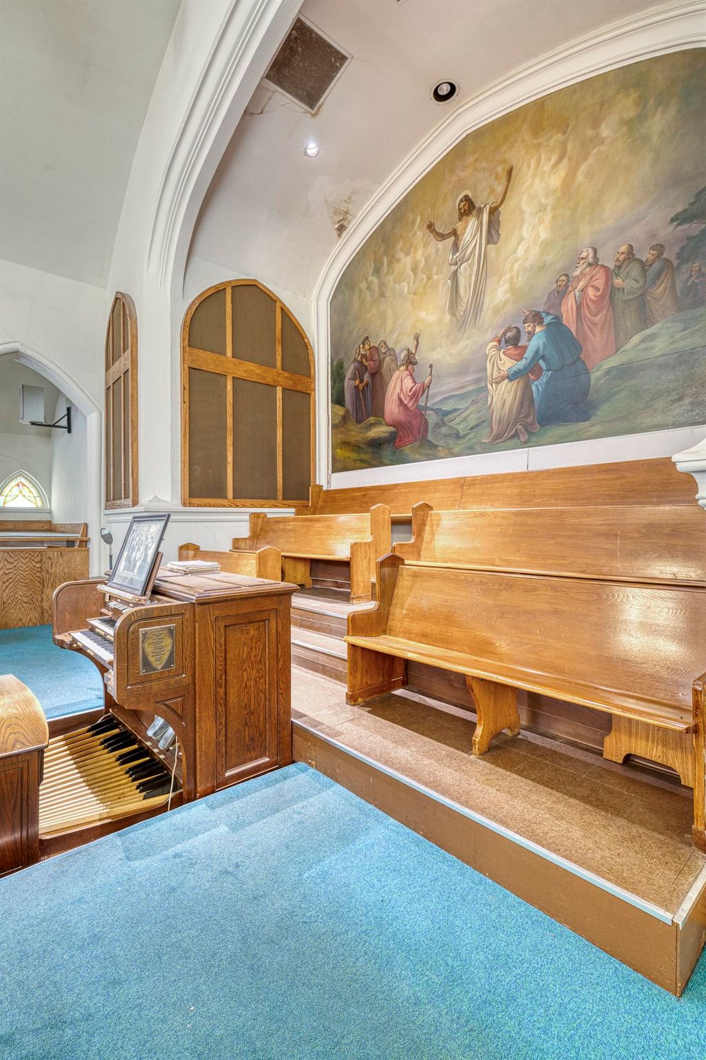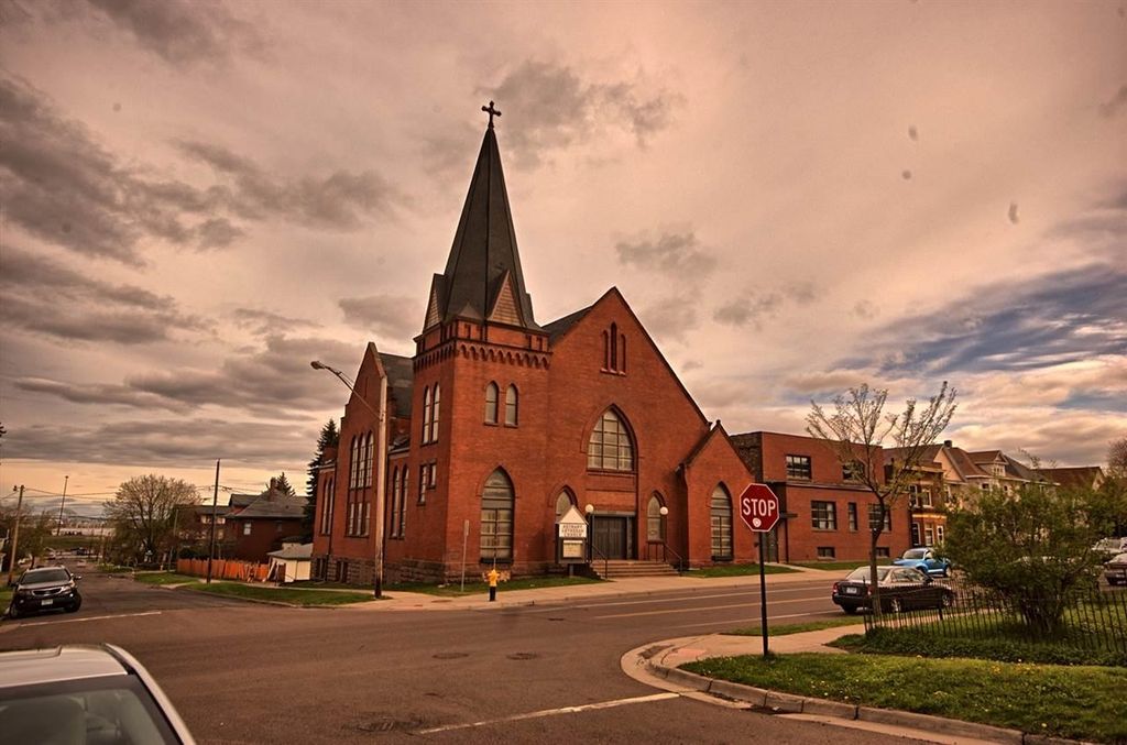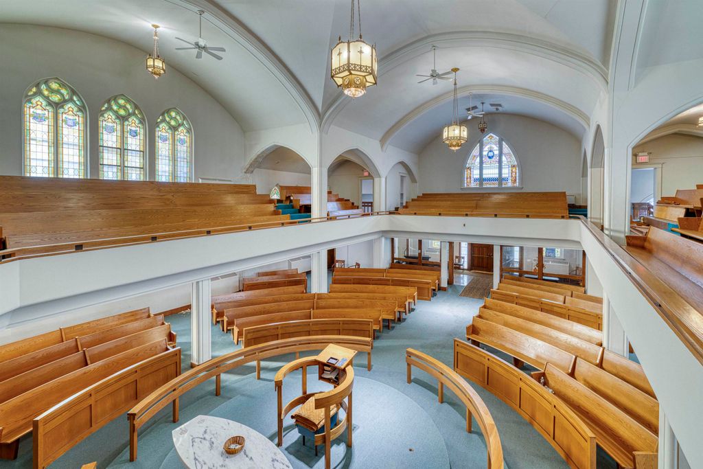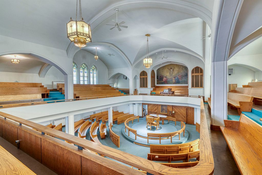 An unusual design for a 1903 Church building, the oak pew Sanctuary is designed in the round, allowing for viewing from all angles. There are numerous classic stained-glass windows appraised in 2018. The Organ remains in the building, but has not been played for a few years; and a large, beautiful Christian Painting hangs above the Organ, the focal point of the wrap around Balcony. The double wooden front doors enter the Narthex. Behind the Sanctuary are Office spaces leading to a rear staircase and private exit. The Lower level boasts a Parlor, Large Dining Hall, Kitchen, Restrooms, Office/Library, and storage area. The Annex building includes 2 apartments plus 2 floors of space for creative use, including a Fireplaced lowest level with walk out to a Parking area. It is attached to the Church by a hallway and has Front and Rear entrances. Though the buildings need considerable updating, large square footage and multi-levels make options possible. City codes will need to be met by the Buyer.
