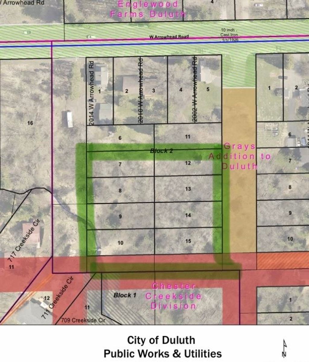 Welcome to this semi-private, centrally located building site that offers roughly 250' of frontage along Chester Creek! There are numerous possibilities to be had here with these 8 lots, making up an unmatched 1.4 acres of pristine land with a hearty mix of old growth tall pines, cedars, ash, poplar, alder, and more. These lots have been held in preservation for years but the time has come for someone to have options to explore. Close to the Kenwood shopping plaza, not far from St. Scholastica and UMD, and a variety of other parks, trails, and nearby amenities. Here you'll find the perfect combination of convenience, seclusion, & wildlife. The property is tucked back off of Arrowhead Rd. There is trail access for showings, and a dedicated roadway already platted that will provide direct access once building plans progress. City utilities (Water, gas, sewer) will come in along with the road. Call your agent to learn more about the opportunities here. Showings by appointment only.