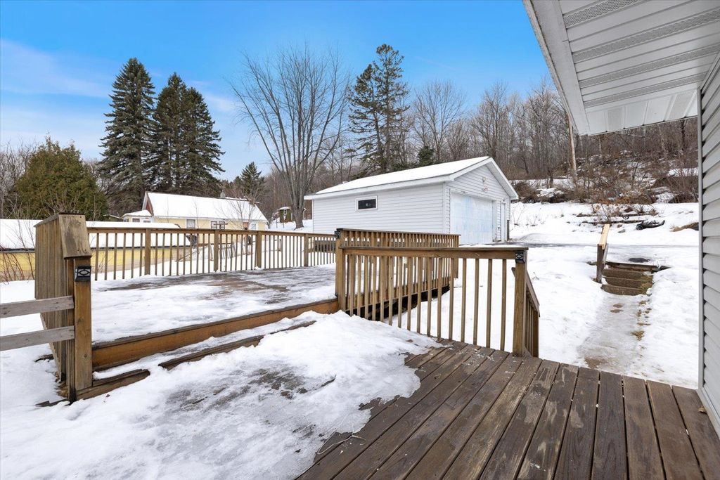 One-level home offering approximately 754 finished square feet with two bedrooms and two bathrooms. The main level includes a living room, kitchen, dining area, mud room, and screened porch, with both bedrooms located on the main floor. Additional space is provided by a full basement that includes a bathroom, laundry, and utility areas. Features include city water and sewer, oil-fired forced air heating, central air conditioning, vinyl exterior, and asphalt shingle roof. The property includes a detached two-stall garage, deck, and multiple parcels creating an irregularly sized residential lot within the city of Duluth.