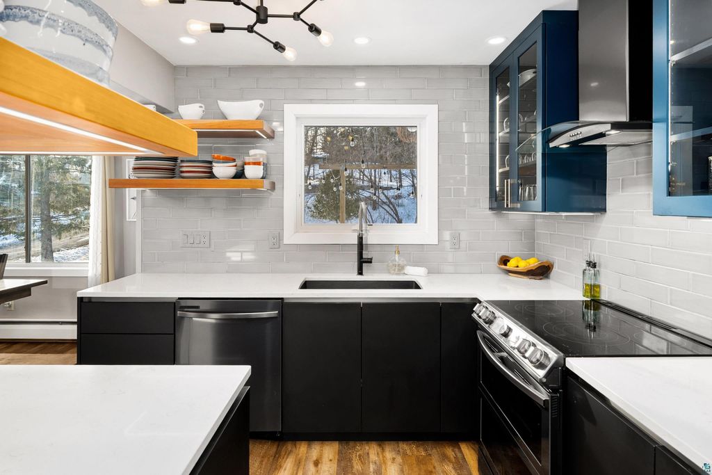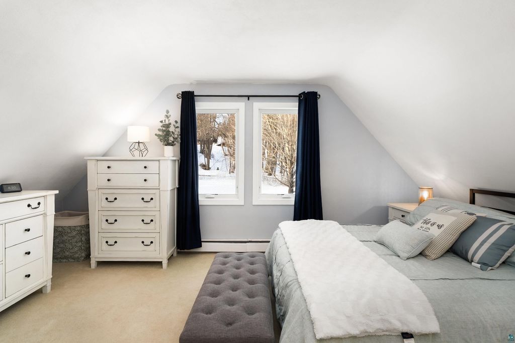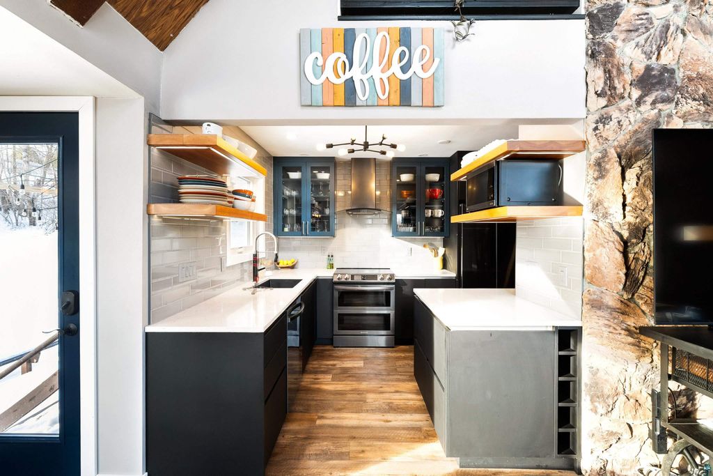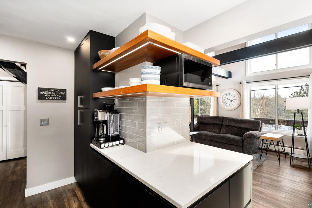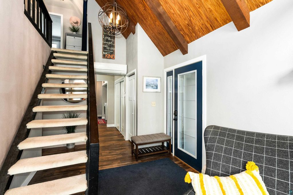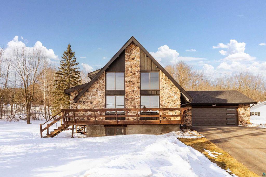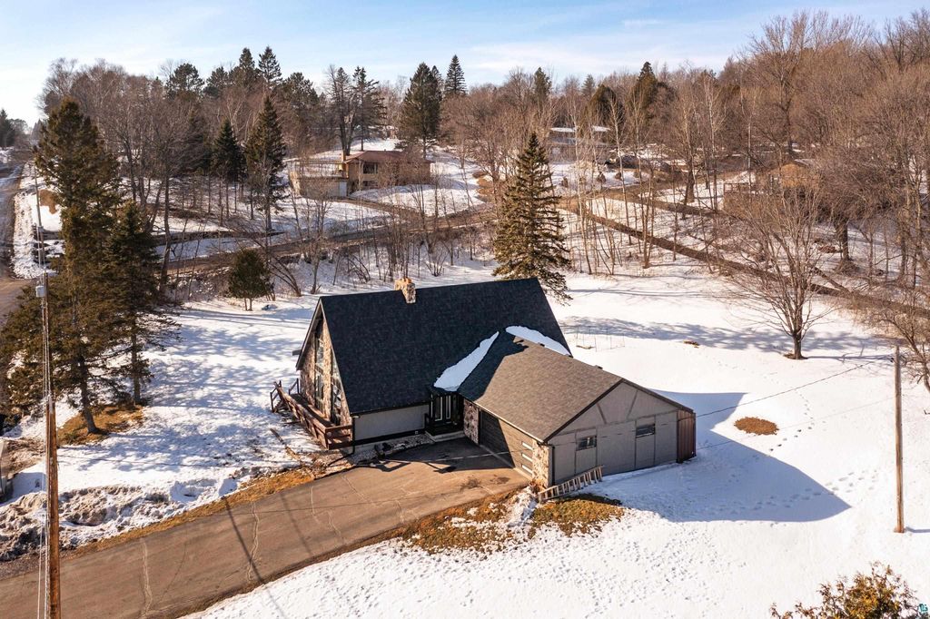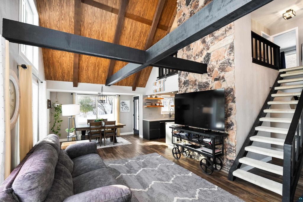 Welcome to this thoughtfully updated home offering approximately 2,100 square feet of inviting living space, soaring ceilings, and timeless design details. From the moment you arrive, you'll appreciate the curb appeal, featuring a stucco and stone exterior, a new roof (2023) and siding updates, and a paved driveway leading to the attached two-car garage. Situated on a south-facing .81 acre lot, get ready for years of gardening, play space and grilling! Thanks to newer Marvin windows, the home is filled with natural light, which highlights the design elements: the 20+ foot cathedral ceilings, exposed beams, and an open staircase. Just add your art! The Hemma Living-designed & updated kitchen is both functional and stylish, featuring quartz countertops, Samsung appliances, floating shelves, and multiple pantry spaces for exceptional storage. Enjoy the convenience of a main-floor laundry, updated bathrooms, custom blinds throughout, and a primary area with its own loft space! A mini-split cooling system provides year-round comfort. The lower level offers additional storage and flexible living space with the option to add a future fireplace. With a spacious yard, thoughtful updates throughout, and move-in ready condition, this home offers the perfect blend of character, comfort, and functionality.