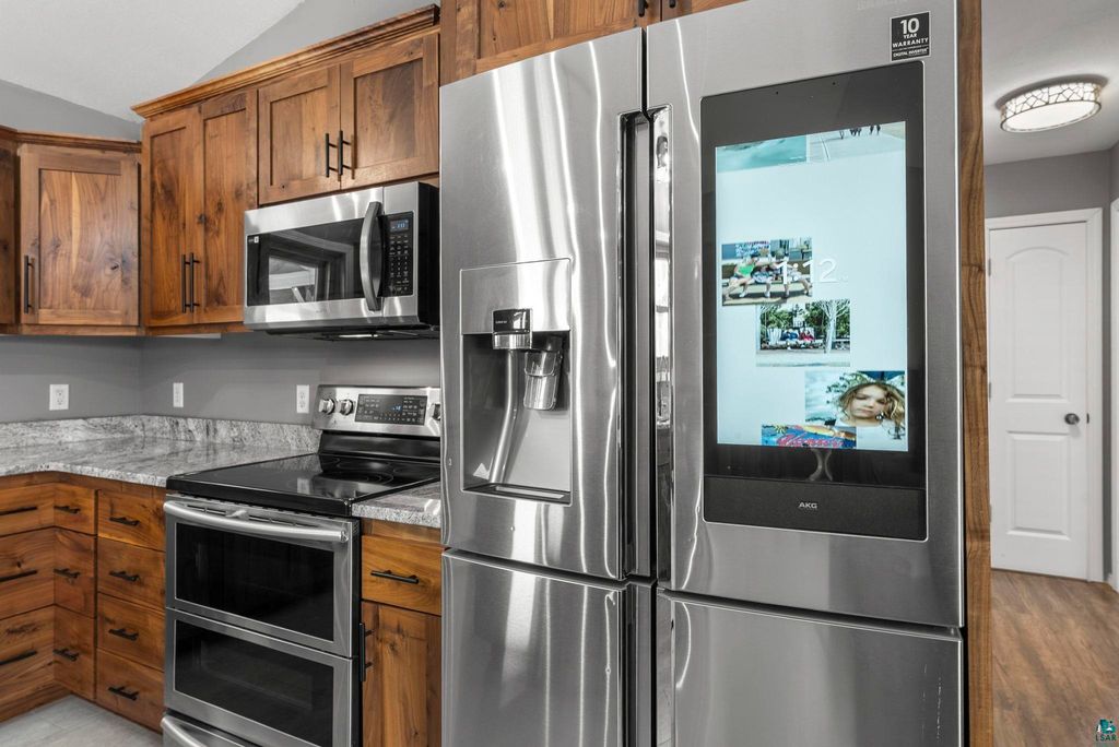 Beautiful acreage property with a recently renovated kitchen (2022) with granite counter tops, rustic black walnut cabinets, center island/breakfast bar area... stainless steel appliances, smart refrigerator and smart sink... Slow close cabinets, pull out pantry cupboards, waterproof vinyl kitchen and dining floors. Open kitchen dining and living with vaulted ceilings. New deck in 2025 with 24x26 at its longest points. Steel deck gazebo deck can be included. 4 BR, 2 BA Split entry, wooded lot on riverfront, 3 miles from I-35. Large lower level family room. 2 BRs on each level and a full bathroom on each level. Fenced backyard and plenty for yard space to enjoy your hobbies. Room for some animals or an outbuilding... 2 stall Heated/Insulated garage 23x23 with in floor heat and new steel insulated garage door. Also two storage sheds. 12x20 Old Hickory Built shed and another 12x12 shed. Appliances included. Beautiful property inside and out.