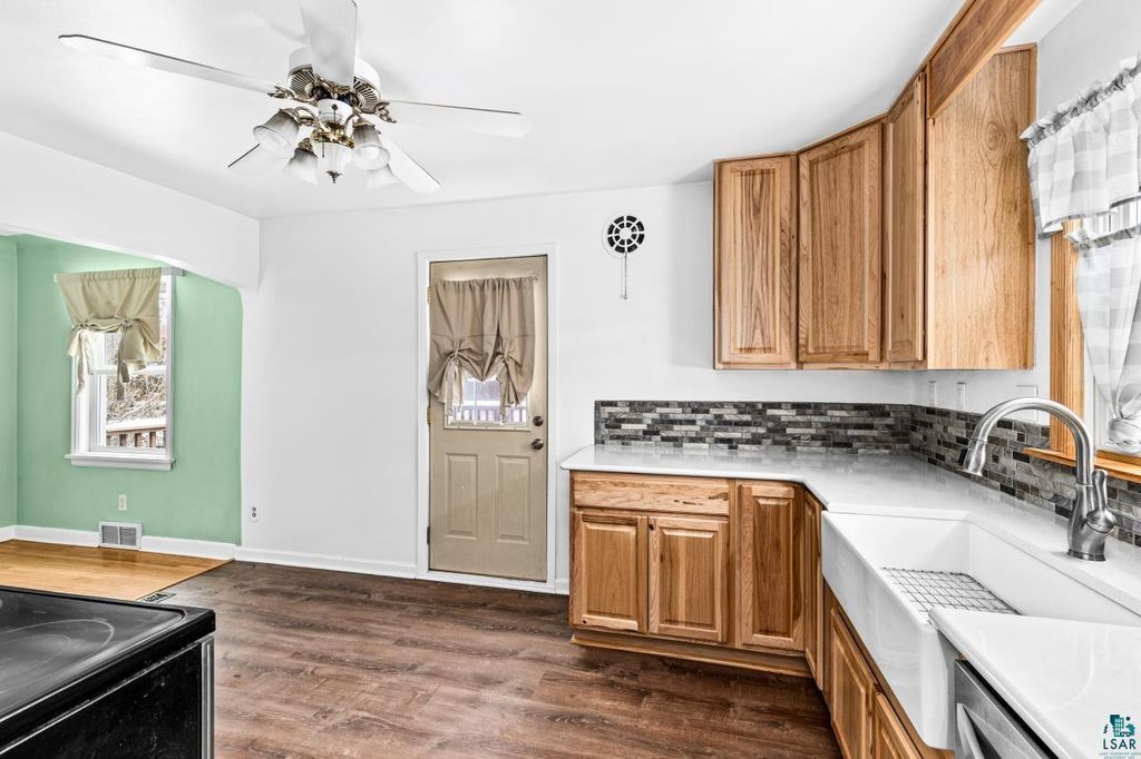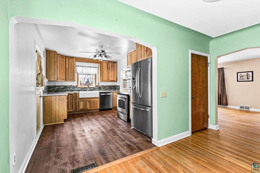 Welcome to this move-in ready 4 bedroom 2 bath expansion Bungalow with remodeled kitchen and bath and beautiful hardwood floors. The kitchen features hickory cabinets and stainless steel appliances. Living room has a wood burning fireplace and oak hardwood floors. Maintenance free exterior, vinyl replacement windows, and newer high efficiency furnace and water heater. Outside you will find a large deck and fenced back yard. Just move in and enjoy!
