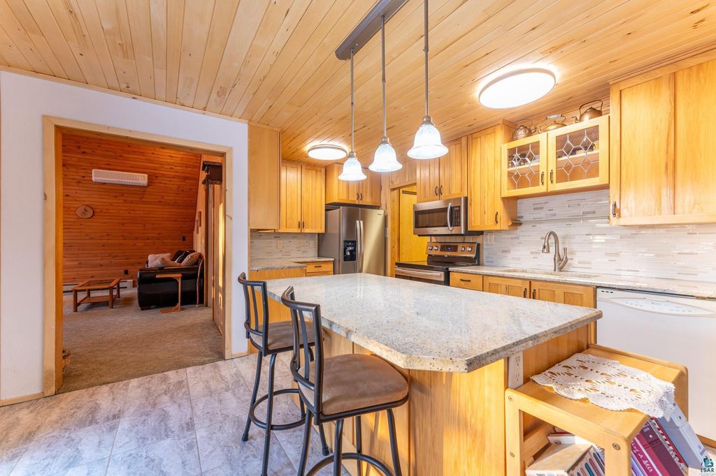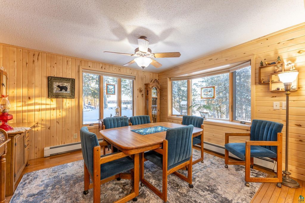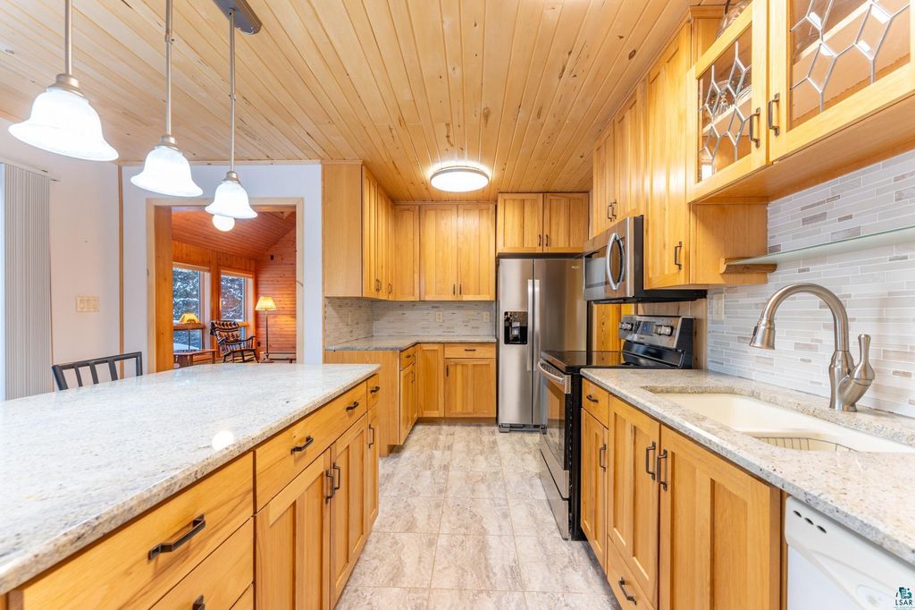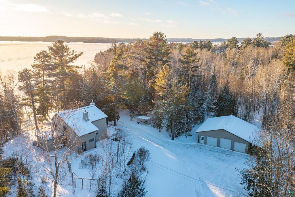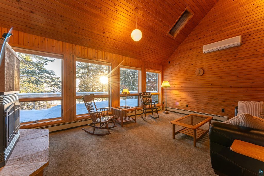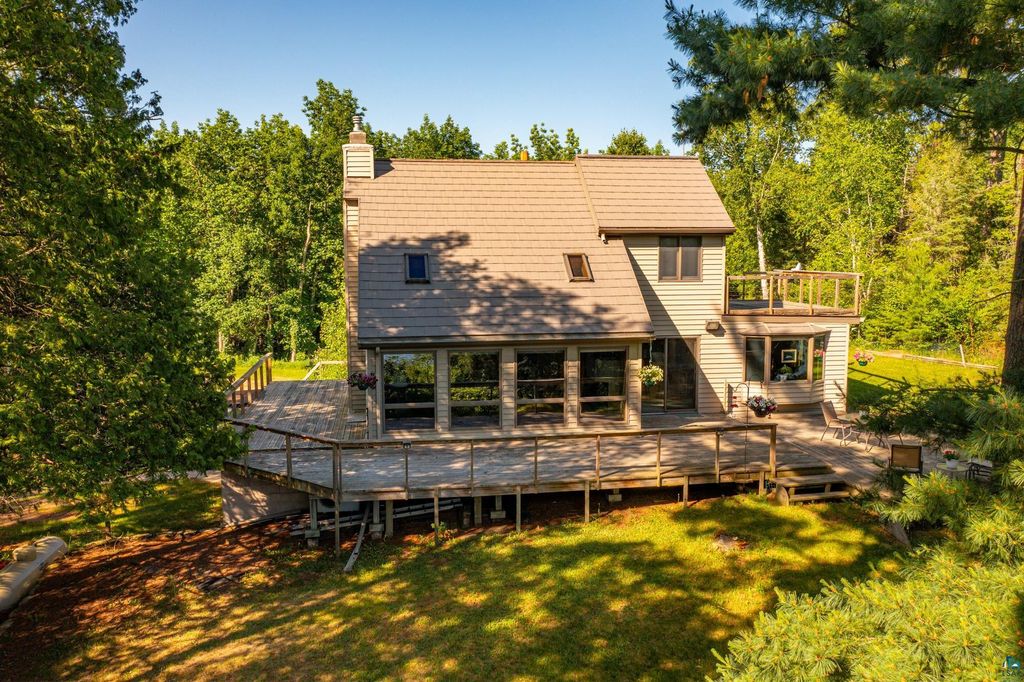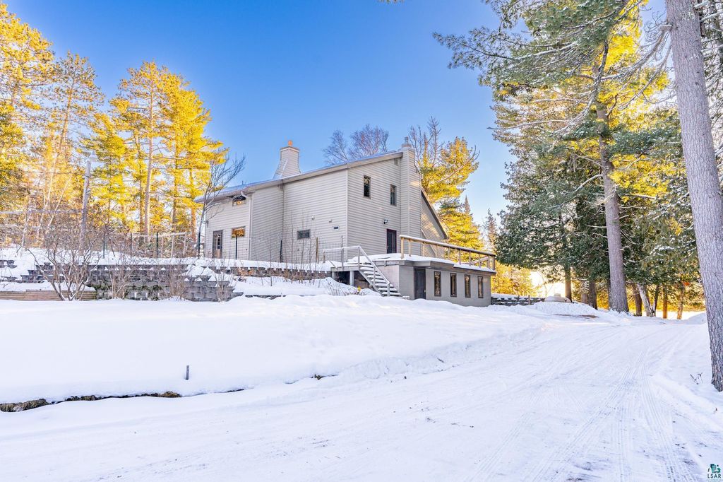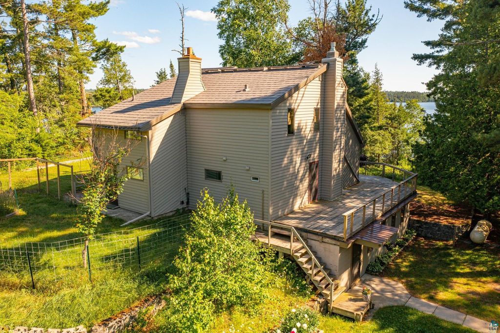 Privately spanning two parcels on a secluded 27.5-acre wooded peninsula, this extraordinary Shagawa Lake property offers an almost unheard-of 2,700+ feet of southwest-facing shoreline, a scale of waterfront ownership rarely available and nearly impossible to replicate today. With panoramic sunset views, towering pines, and complete privacy just five miles from Ely, this is a true Northwoods legacy property. The centerpiece of this property is a well-built, year-round three-bedroom, two-bathroom home designed for comfort and a strong connection to its surroundings. The spacious living room features vaulted ceilings, a propane fireplace, and floor-to-ceiling windows that frame stunning lake views. Skylights bring in natural light, while rich wood finishes add warmth and character. The kitchen is both stylish and functional, with granite countertops, a tile backsplash, and a center island. Sliding doors lead to a large lakeside deck, perfect for outdoor dining and relaxation. The dining room showcases oak flooring, a bay window, and an open layout ideal for gatherings. Upstairs, three well-appointed bedrooms offer picturesque lake views, with the primary bedroom featuring a private deck. The lower level includes a comfortable entertainment room with custom built-ins, a freestanding propane fireplace, and plenty of space to unwind. Outside, the 2700+ feet of shoreline transitions gracefully between sandy, level beaches and dramatic rock ridges, creating a landscape as diverse as it is beautiful. A 36x40 three-stall garage with steel siding provides ample storage. Modern utilities, including a drilled well and an inspected septic system, ensure ease of ownership. A rare opportunity to acquire a truly private Northwoods year-round retreat on one of Ely's most sought-after lakes. Properties of this size and shoreline seldom come available.