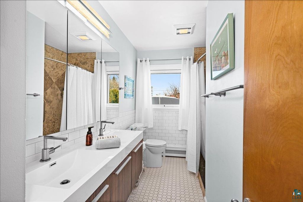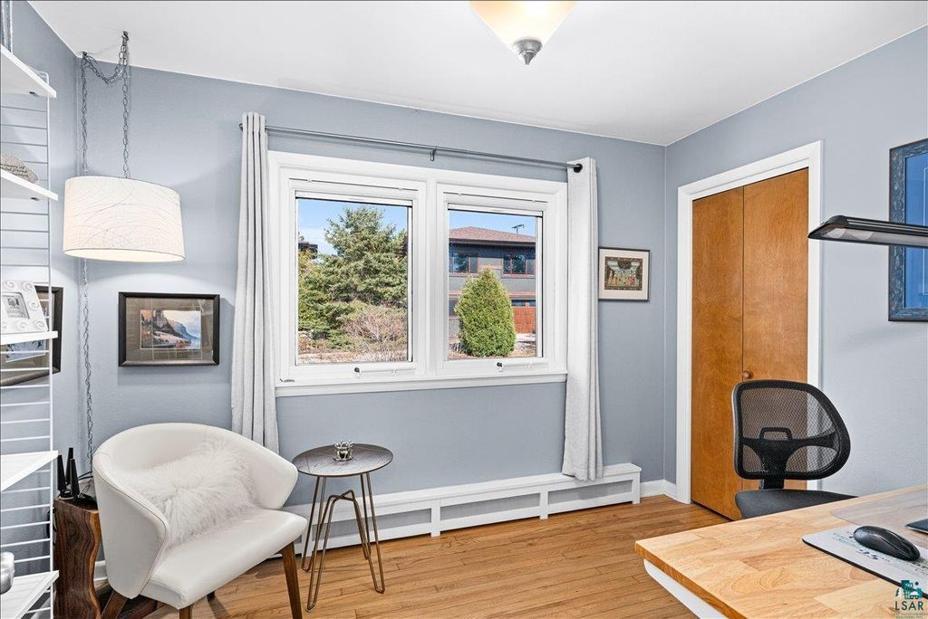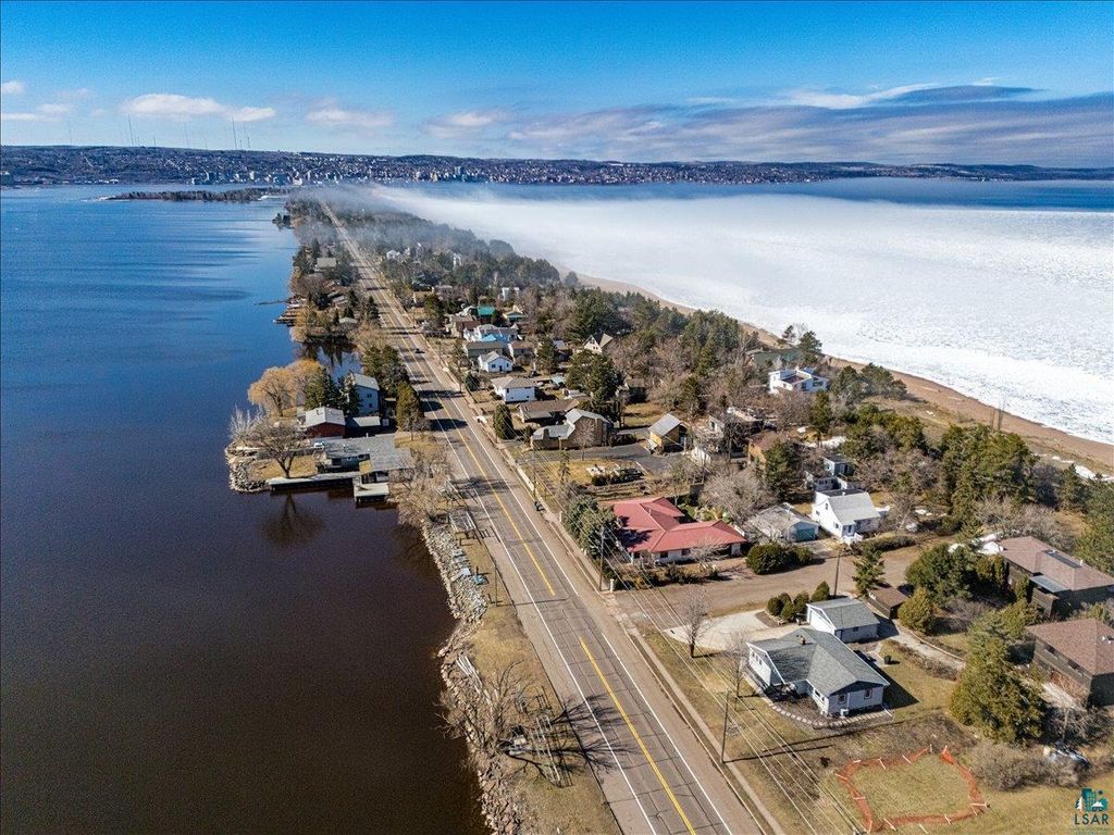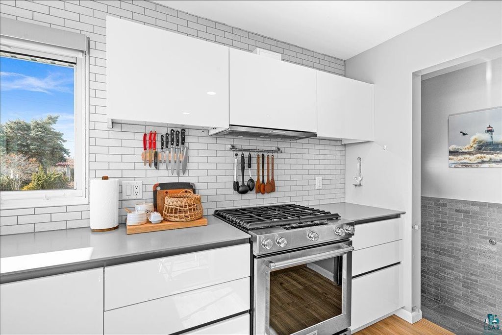 Stunning 3-bedroom Park Point ranch with panoramic views of the bay, Blatnik Bridge, and hillside! Whether you're a local looking to live on the Point or searching for the perfect urban cabin, this beautifully updated home is sure to impress. You'll love the spacious, sun-filled living room offering incredible views, refinished oak hardwood floors, and a built-in maple cabinet. The new custom kitchen features gleaming white cabinetry, Cambria countertops, a tiled backsplash, stainless appliances including a gas stove, LVT flooring, a built-in bench with storage, and a wall of windows overlooking the water. The main floor also includes 3 bedrooms with oak flooring and an updated ¾ bath featuring double sinks and a tiled walk-in shower. The lower level offers a cozy den/office, a finished laundry room with a folding table, and plenty of storage space with potential for future living space. Outside, you'll find a landscaped yard with a small deck, patio, covered front porch, and a 2-car garage with 30-amp service. Additional upgrades include steel siding, 200-amp electrical, all new mechanicals including an air-to-air exchanger and mini split, and new windows. With public beach access just down the road, bay access across the street, and an easy bike ride to the Lift Bridge and Canal Park attractions, you'll be living your best Park Point beach life!