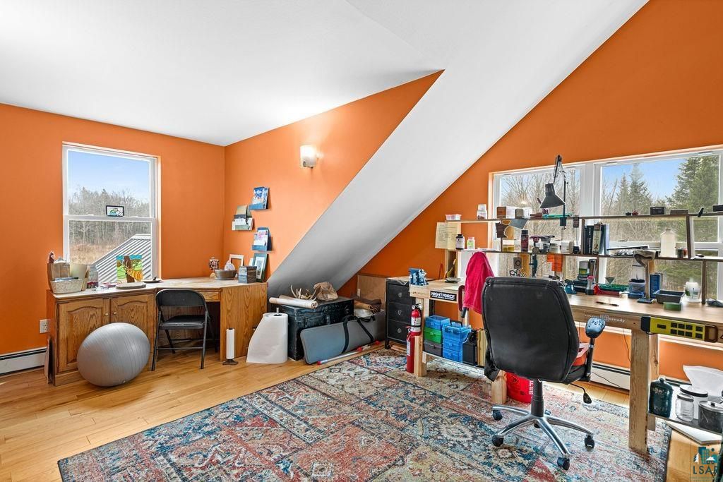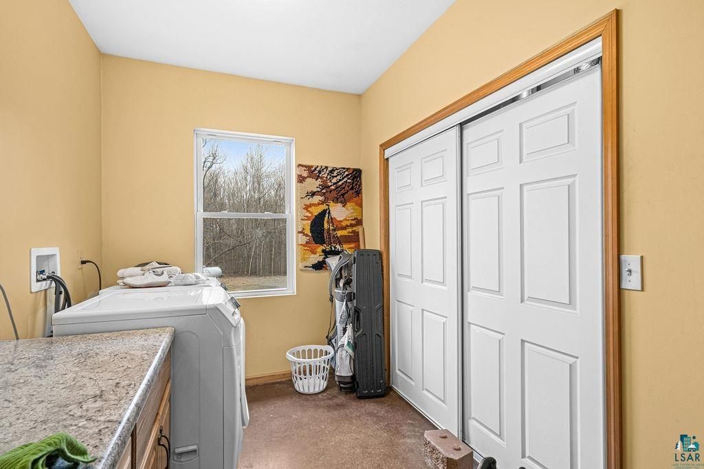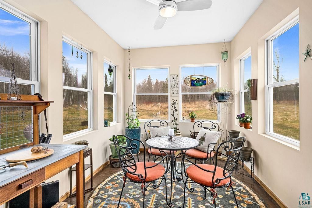 Life unfolds differently on 40 acres in the Northwoods-wildlife & privacy, the space invites both solitude & connection. A mix of wooded & open/pastureland creates room to explore, gather, & live intentionally - many Sugar Maples here for syruping. The expansive, vaulted home is designed for comfort & flow, including radiant in-floor heat & stained concrete floors. The great room is open to dining, 4 season sunroom & a spacious kitchen, including stone countertops, hickory cabinetry, pantry & large island. A main-level primary suite, large bath, walk-in closet, additional bed, bath & laundry assure main level living. A loft, 2 generous bedrooms, walk-in closet & bath complete the floorplan. The attached 3-stall garage is heated, a tucked away cabin welcomes guests. Solar power, whole home generator, propane heat, compliant septic system & drilled well support a self-reliant lifestyle. 20 minutes to Two Harbors, 5 minutes to Hugo's Bar and general store, surrounded by lakes and trails.